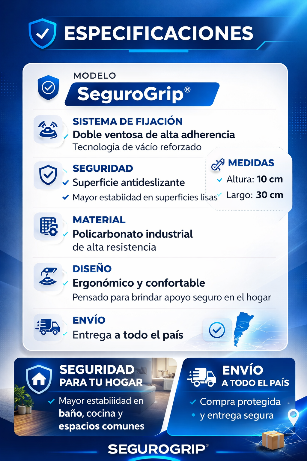 Sentite seguro en tu baño, cocina o cualquier superficie lisa con SeguroGrip®, la agarradera con sistema de succión reforzada diseñada para brindar estabilidad inmediata sin perforaciones.